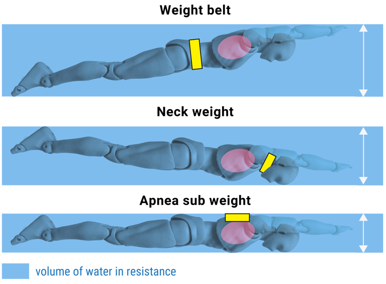 More effective than the weight belt in dynamics. On the other hand, if the weight is too high, you can dive more forward, and offer a resistance to water that is not optimal.