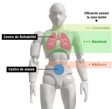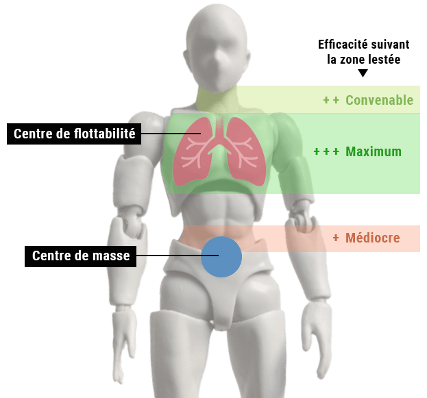 Donc si on veut maîtriser notre flottabilité sous l'eau, le lestage doit être le plus proche de cette zone, pour éviter de déséquilibrer notre position.